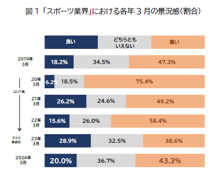 2024年3月のTDB景気動向調査によると、「スポーツ業界[1]」では、現在の景況感を『良い[2]』と回答した企業の割合(20.0%)が、『悪い[3]』と回答した企業の割合(43.3%)を大きく下回った。