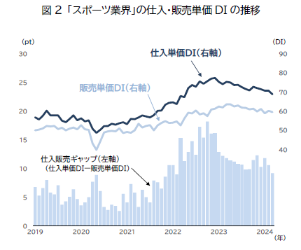 「スポーツ業界」の仕入単価DI[1]と販売単価DIをみると、両データの差(仕入販売ギャップ)が2022年以前との比較で約10ポイント高くなっており、価格転嫁が進んでいないことが分かる(前ページ図2)。景況感が『悪い』と回答した企業からは、「輸入品が多く、円安のため商品価格が高騰。暖冬で冬物衣料の販売が停滞している」(スポーツ用品小売)、「ゴルフの練習に来る人が昨年をピークに落ち着いてきている」(ゴルフ練習場)などの声があがった。「3密」を避けられるレジャーとして人気を集めたゴルフ市場の一服感や、円安による原材料や輸入品の価格高騰、在庫の滞留などが景況感にブレーキをかけている様子がうかがえる。