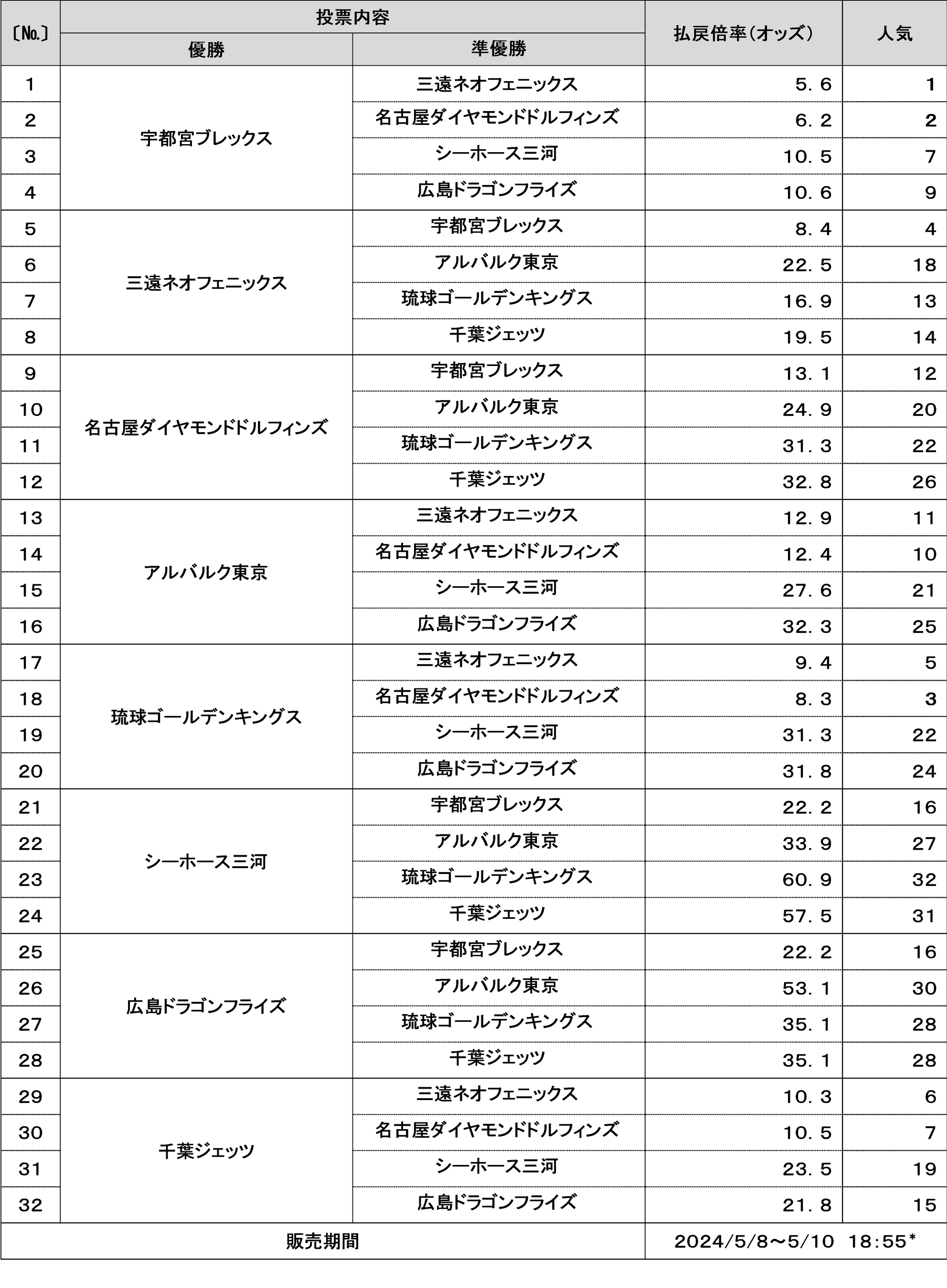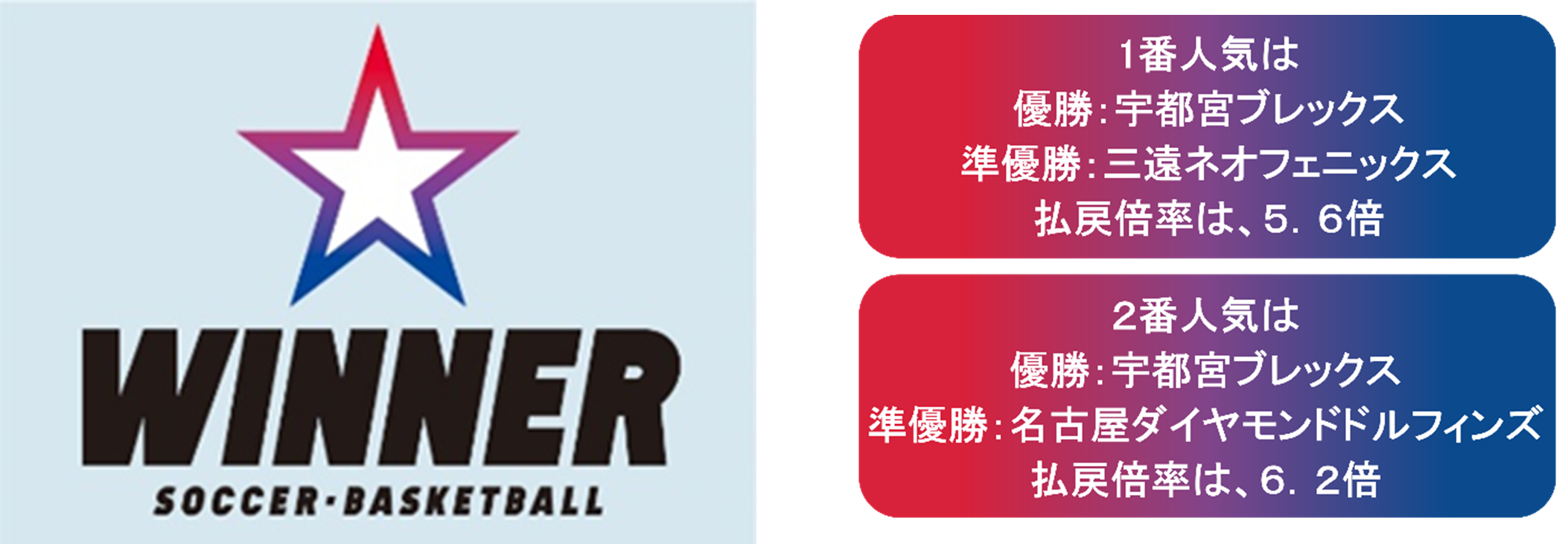 優勝・準優勝予想の1番人気は、優勝が東地区1位でレギュラーシーズン勝率85%の宇都宮ブレックス、準優勝が中地区1位でレギュラーシーズン勝率76.7%の三遠ネオフェニックスで、払戻倍率(オッズ)は5.6倍!2番人気は、優勝が宇都宮ブレックス、準優勝が西地区1位でレギュラーシーズン勝率68.3%の名古屋ダイヤモンドドルフィンズで、払戻倍率(オッズ)は6.2倍、3番人気は、優勝が西地区2位でレギュラーシーズン勝率68.3%の琉球ゴールデンキングス、準優勝が名古屋ダイヤモンドドルフィンズで、払戻倍率(オッズ)は8.3倍、となっています。