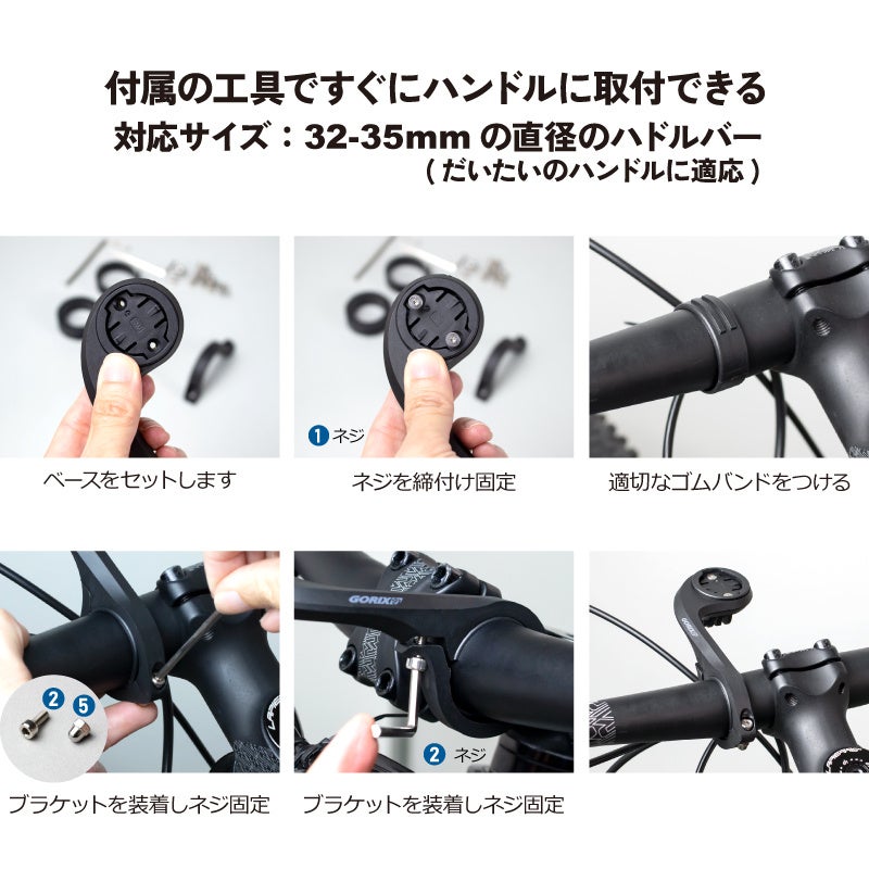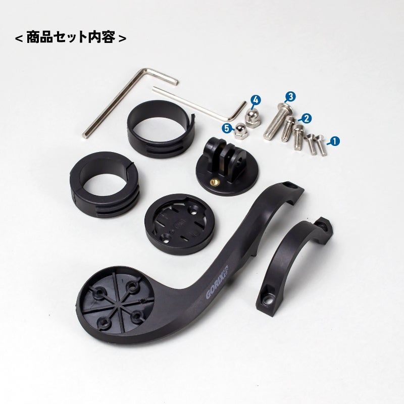 ブラケット本体、Garmin用ベース1個、GoPro/ライトマウント1個、 ゴムリング2個、2mm六角レンチ1個、3mm六角レンチ1個、対応ネジ |