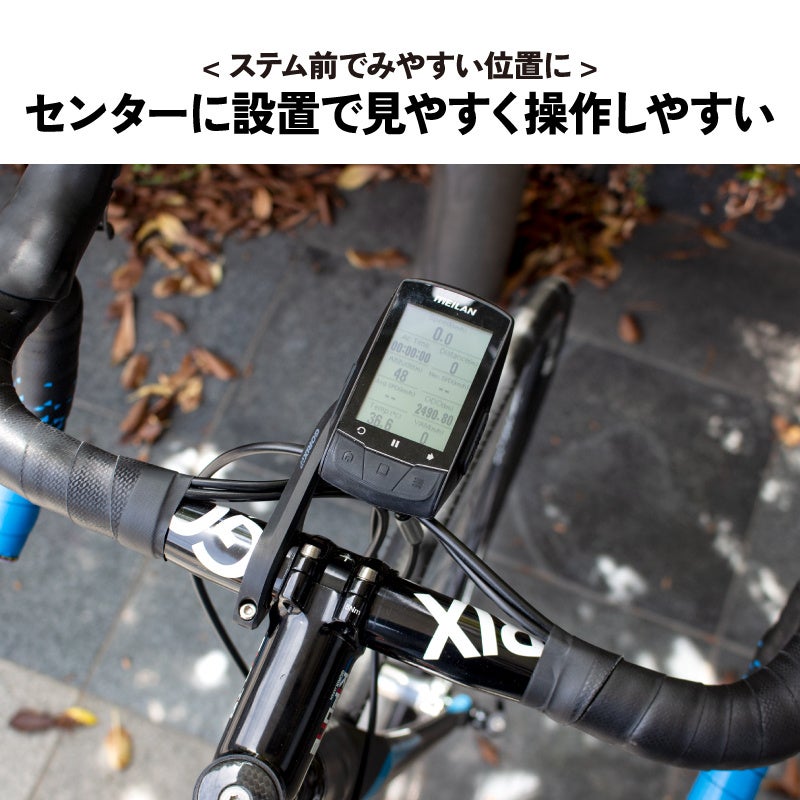 ハンドルより前方で中央にセットしする事でサイクルコンピューターなどのナビ系もみやすい位置になります。