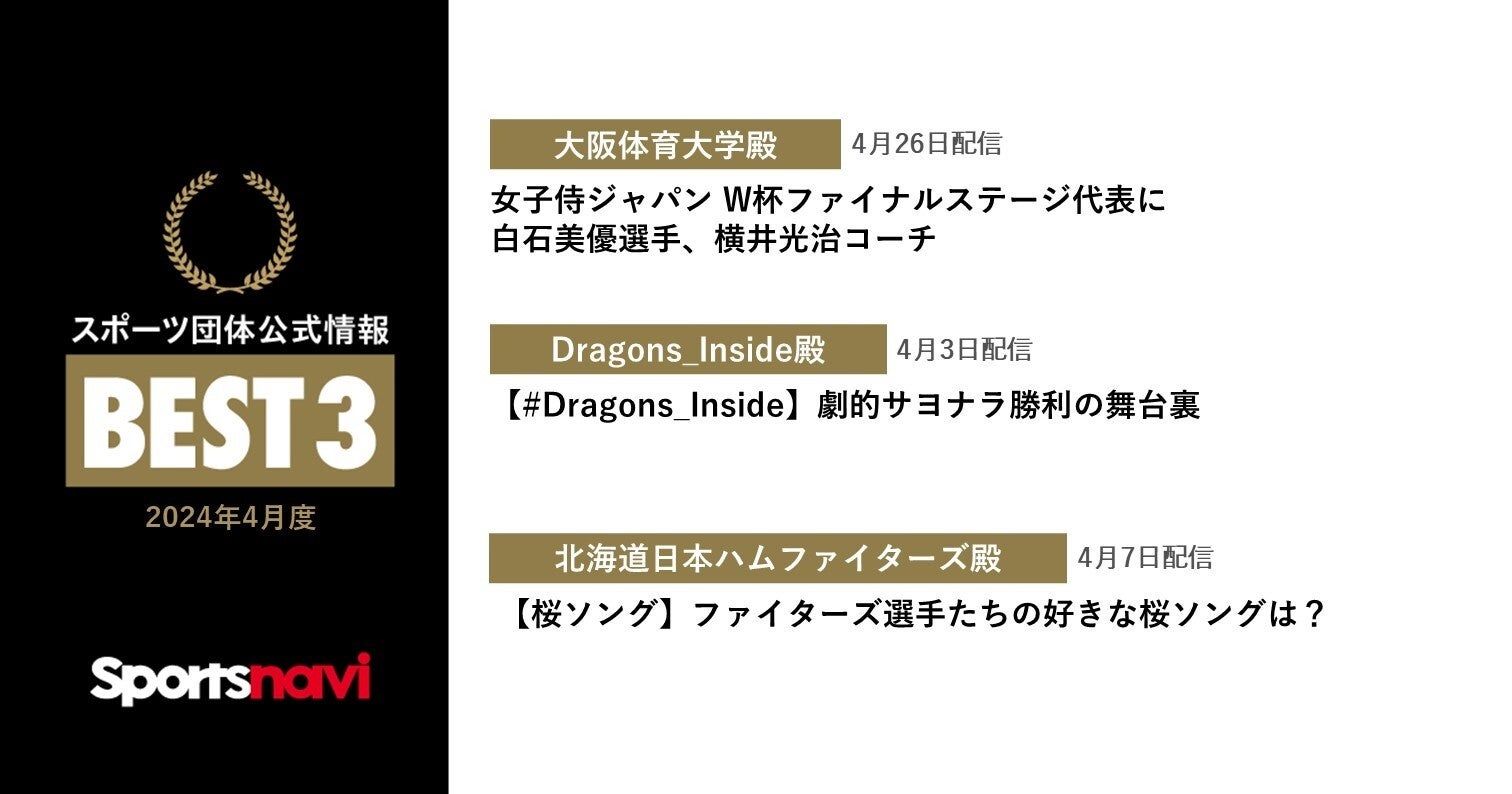スポーツナビでは毎月、公式情報記事・動画配信において最も印象的だった記事・動画3つを選定し、「スポーツ団体公式記事・動画 月間ベスト3」と称して表彰させていただいております。