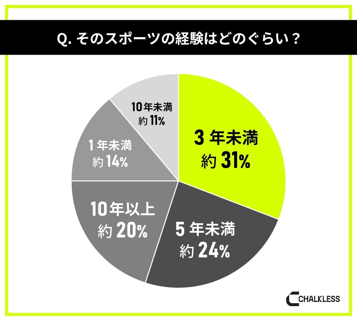 今回の回答者はおよそ3年以上の経験者が全体のおよそ半数、1年未満の人を除いた割合は9割弱と、1年間は継続的にスポーツに取り組んだことがある経験者から回答を得ることができました。