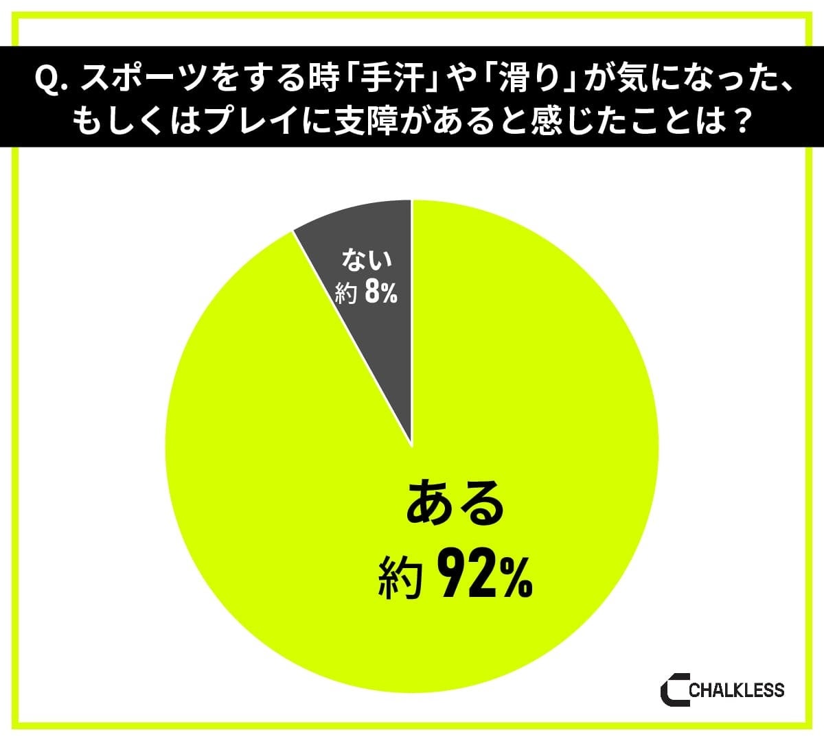 競技中に手汗や滑りが気になった人は約92%と、かなり高い割合で手汗や滑りが気になっていることがわかりました。