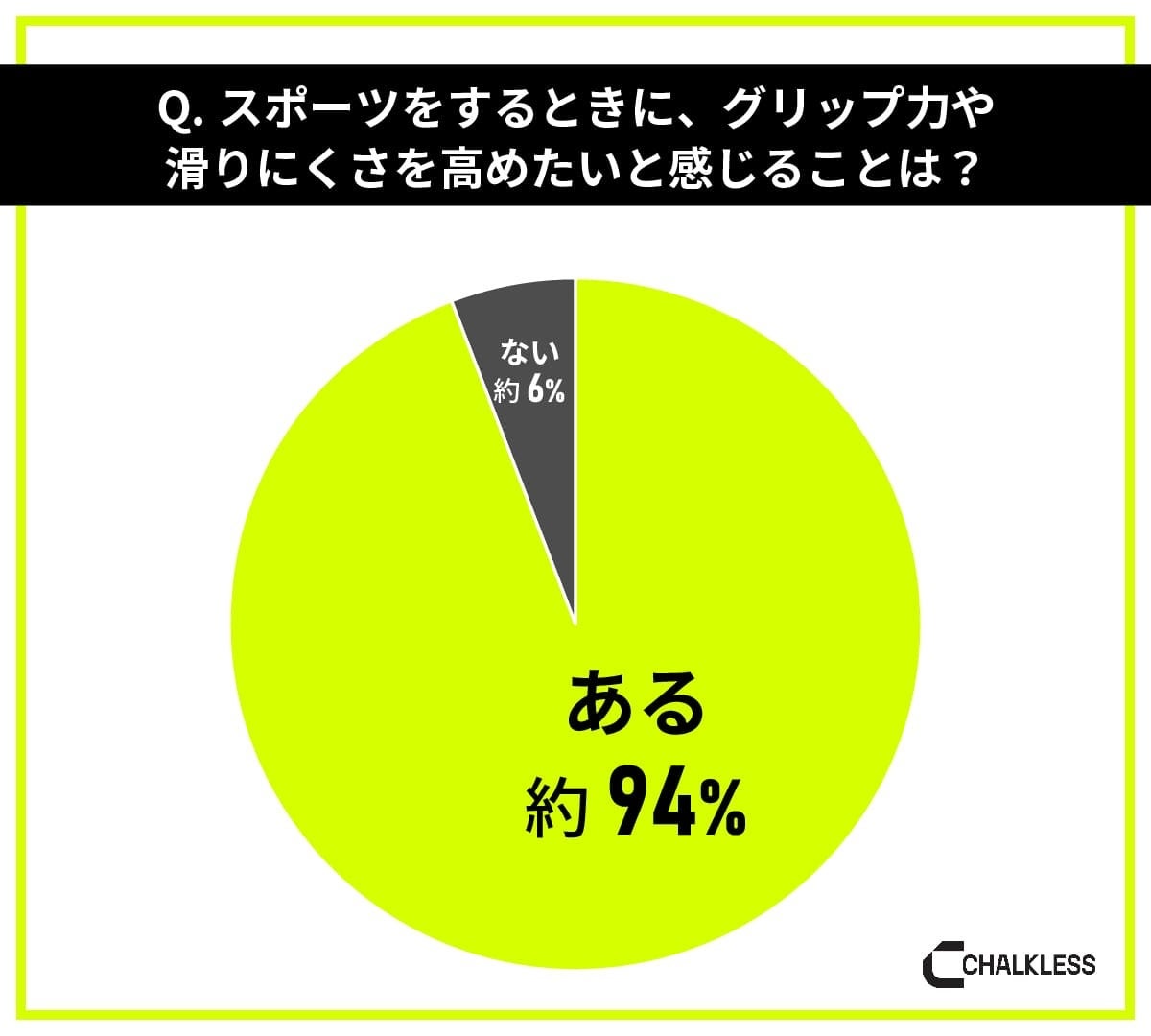 グリップ力や滑りにくさを高めたいと回答した人は約94%と、高い割合で手汗や滑りに関する悩みや課題間を持っている人がいることがわかりました。