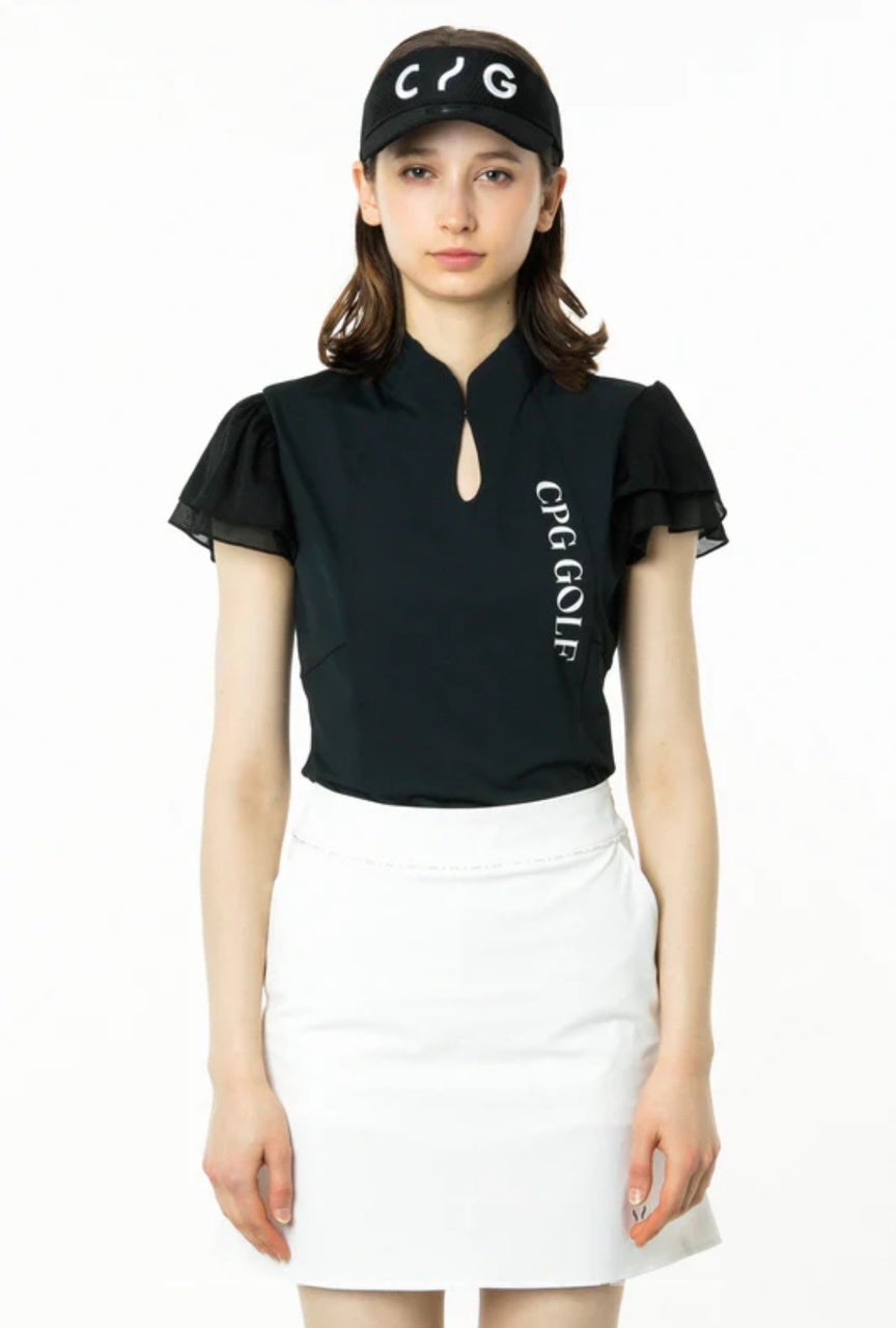 吸水速乾、UVカット、消臭効果ありのしなやかで快適素材。フェミニンなマオカラーとシェイプされたライン、ダブルシフォン袖、甘すぎないクール・ビューティーな主役級シャツ。胸のロゴがスポーティーな印象です。