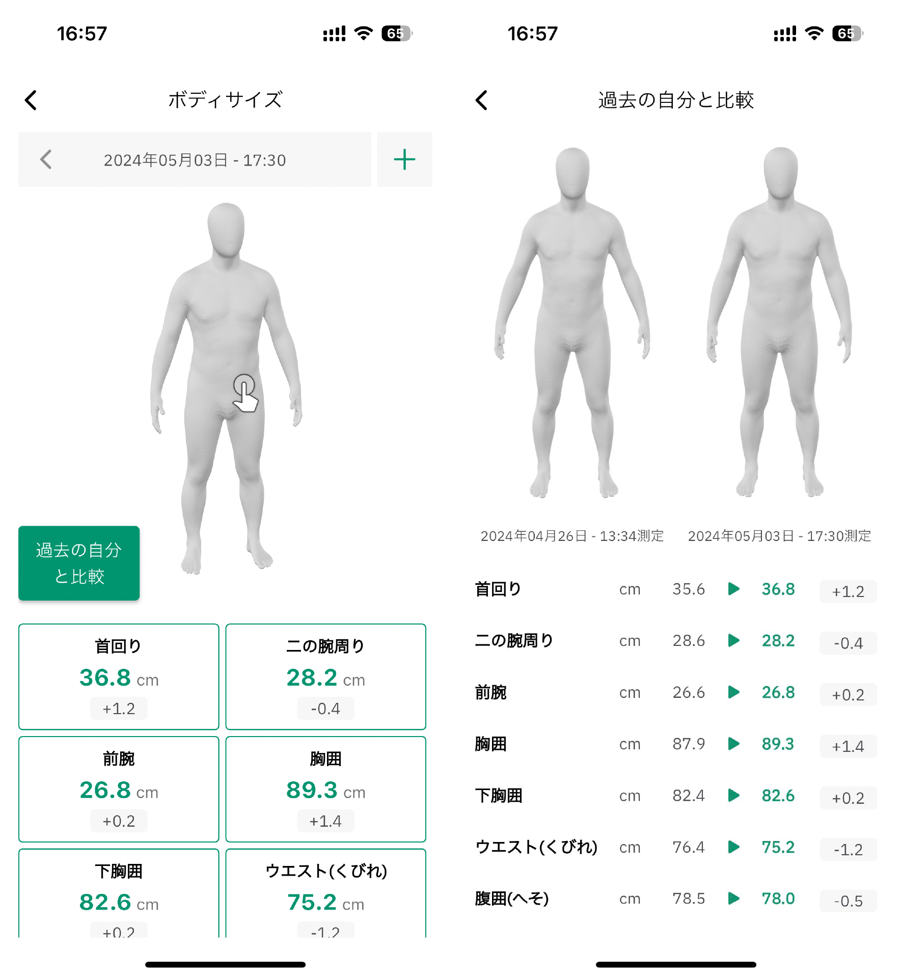 Bodygram(ボディグラム)で計測されたデータは、採寸データだけではなく、3Dボディのイメージや、過去の自分との比較、グラフ等、直観的に変化を感じられるようになっております。