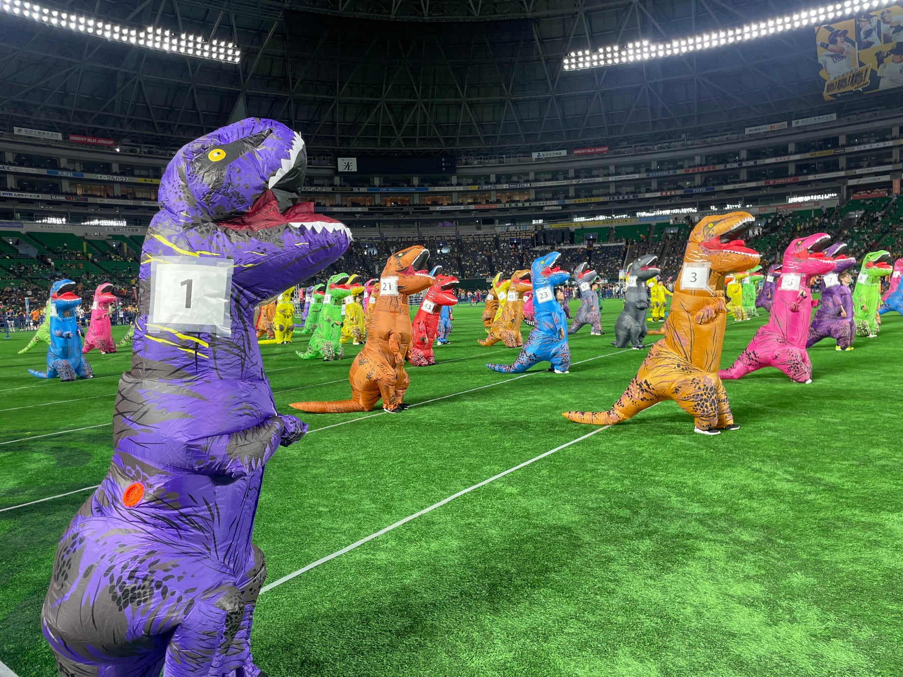 ティラノサウルスレース ※ティラノサウルスの着ぐるみに身を包み、ドーム内に設けられた特設コース(50m)を走り順位を競います。 |