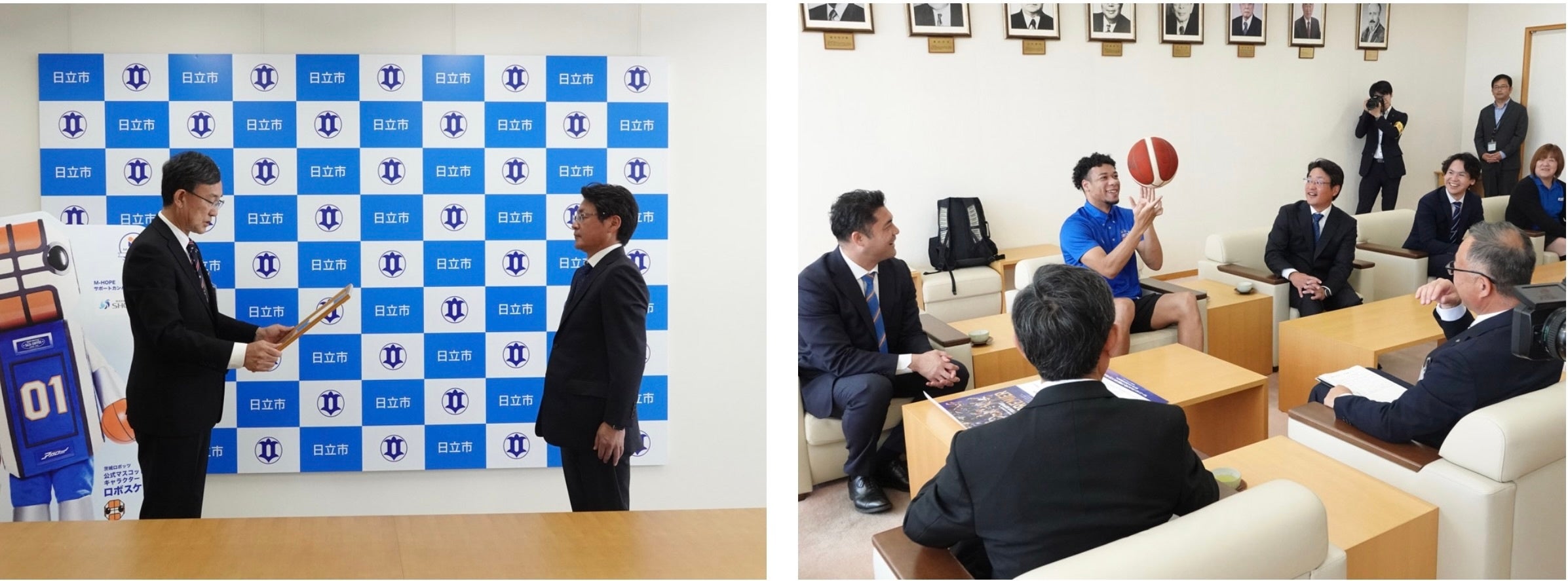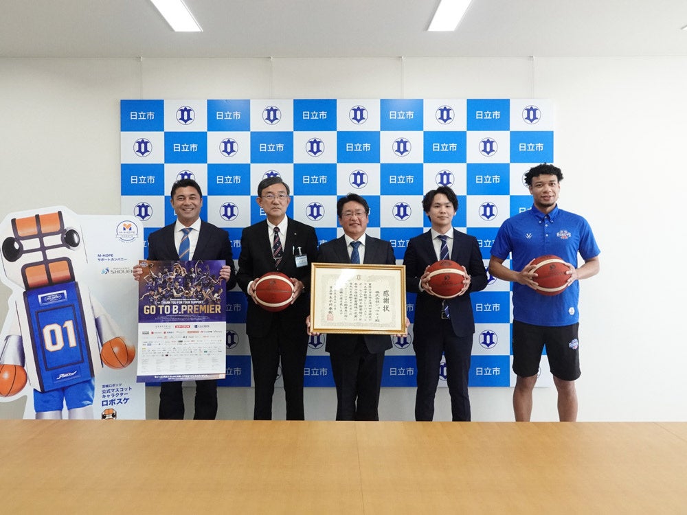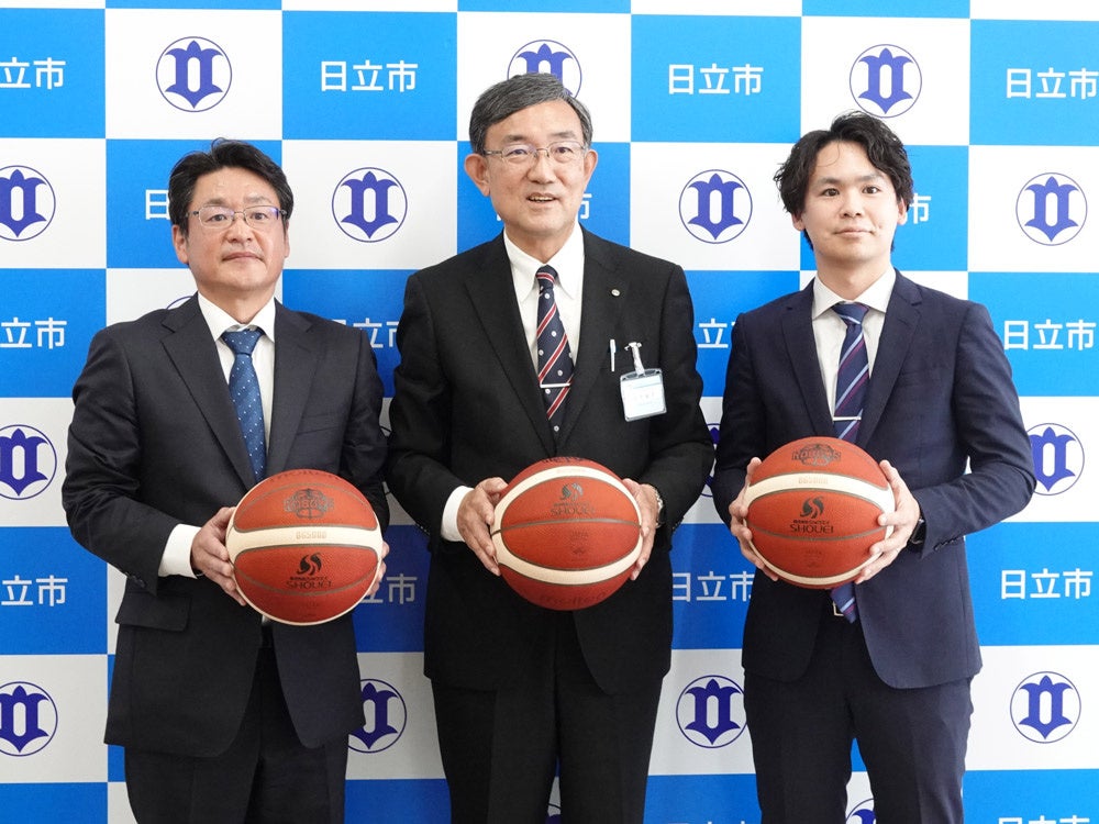 この度、茨城ロボッツでは賛同企業の皆さまと取り組む地域貢献活動「M-HOPE」の一環として、株式会社ショウエイ様のご協賛により、日立市立滑川中学校及び日立市立十王中学校にバスケットボール計20球を寄贈いたしました。
