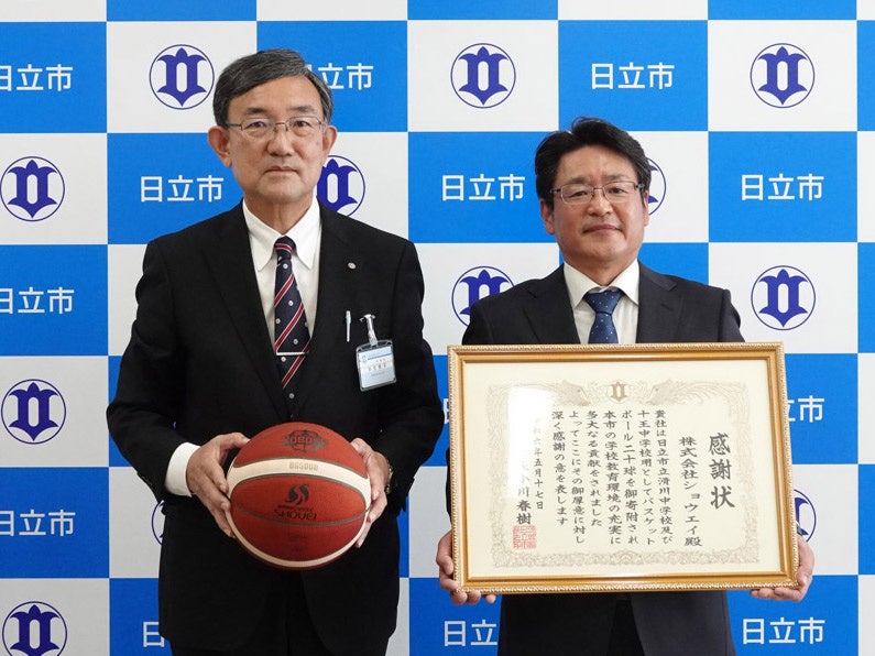 寄贈セレモニーでは、日立市教育委員会 教育長 折笠修平様から、株式会社ショウエイ 代表取締役 庄司剛様へ感謝状の贈呈が行われました。