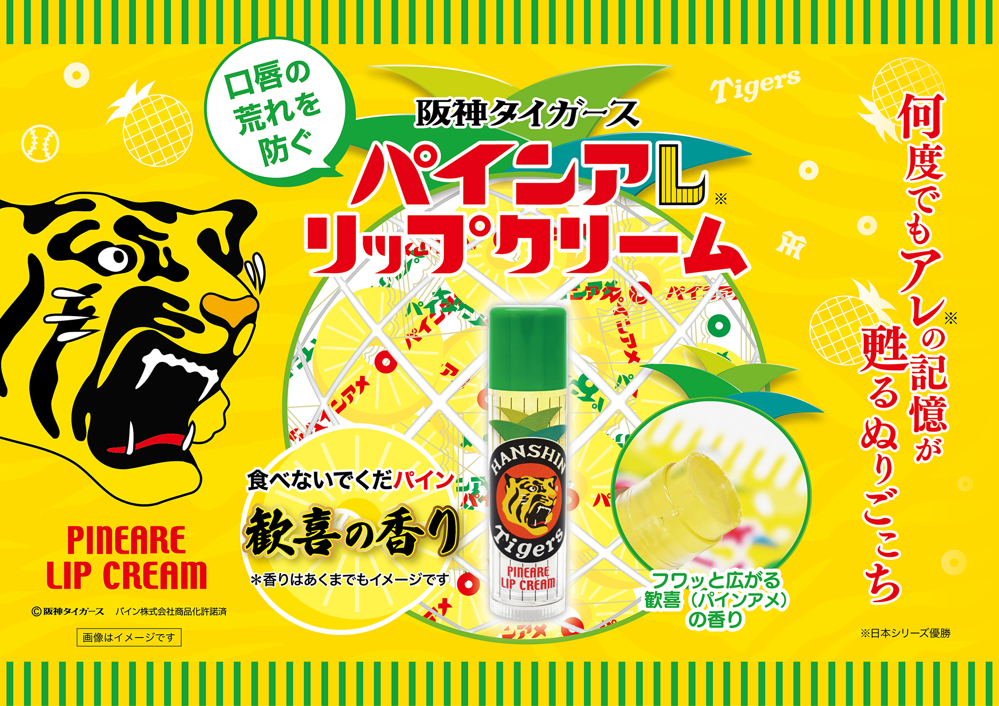 「阪神タイガース」と「パインアメ」がコラボレーションし大旋風を巻き起こした『パインアレ』が、今度はリップクリームになって新登場!パインアメの“甘酸っぱくてジューシー”な歓喜の香りとしっとりとした塗り心地であなたの口唇のアレを防ぎます。