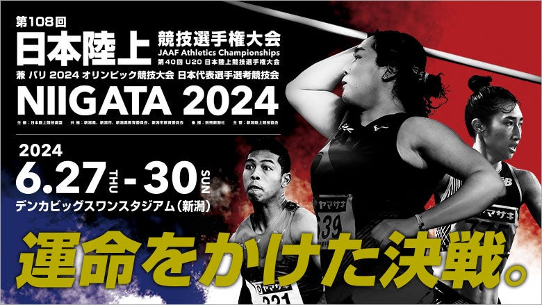 2024年6月27日(木)~30日(日)、新潟県・デンカビッグスワンスタジアムで開催する「第108回日本陸上競技選手権大会(パリ2024オリンピック競技大会 日本代表選手選考競技会 )」。