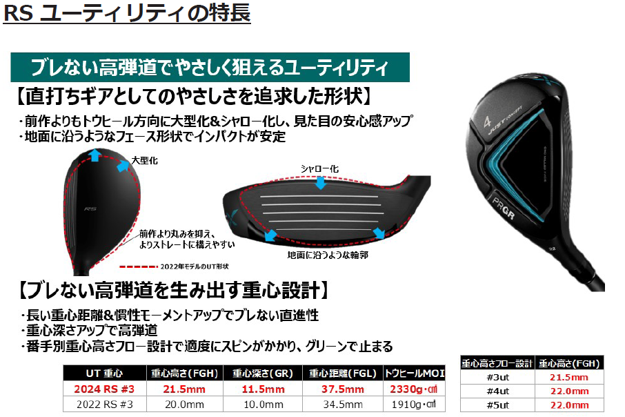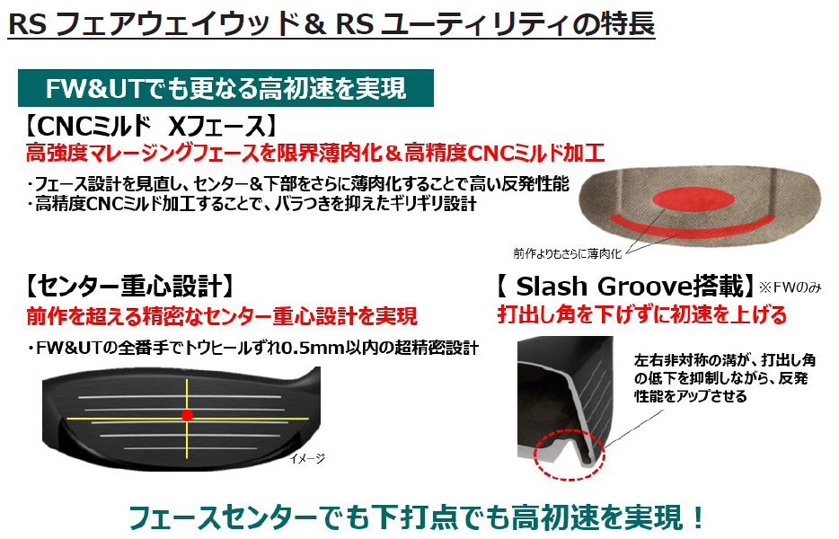 「RS フェアウェイウッド」「RS ユーティリティ」は、高強度マレージングフェースに高精度 CNC ミルド加工を施した「CNC ミルド X フェース」を搭載し、重心点を精密にセンターに配置することで、フェースセンター及び下打点でも高初速を可能としています。フェアウェイウッドには打ち出し角を下げずに初速を上げる「Slash Groove(スラッシュグルーブ)」といった従来からの技術を進化させ、さらなる高初速を実現しました。また今回、地面からの直打ちギアとしてのやさしさを追求してヘッド形状を見直し、従来品より大型化、シャロー化することで見た目の安心感が向上したのに加え、地面に沿うフェース形状でインパクトの安定を図っています。さらに、従来品よりも大きな慣性モーメントと深重心設計で、ブレない直進性と高弾道の再現性を高めているほか、番手別重心高さフロー設計で適度なスピンがかかり、グリーンで止まる、狙えるフェアウェイウッド、ユーティリティとなっています。
