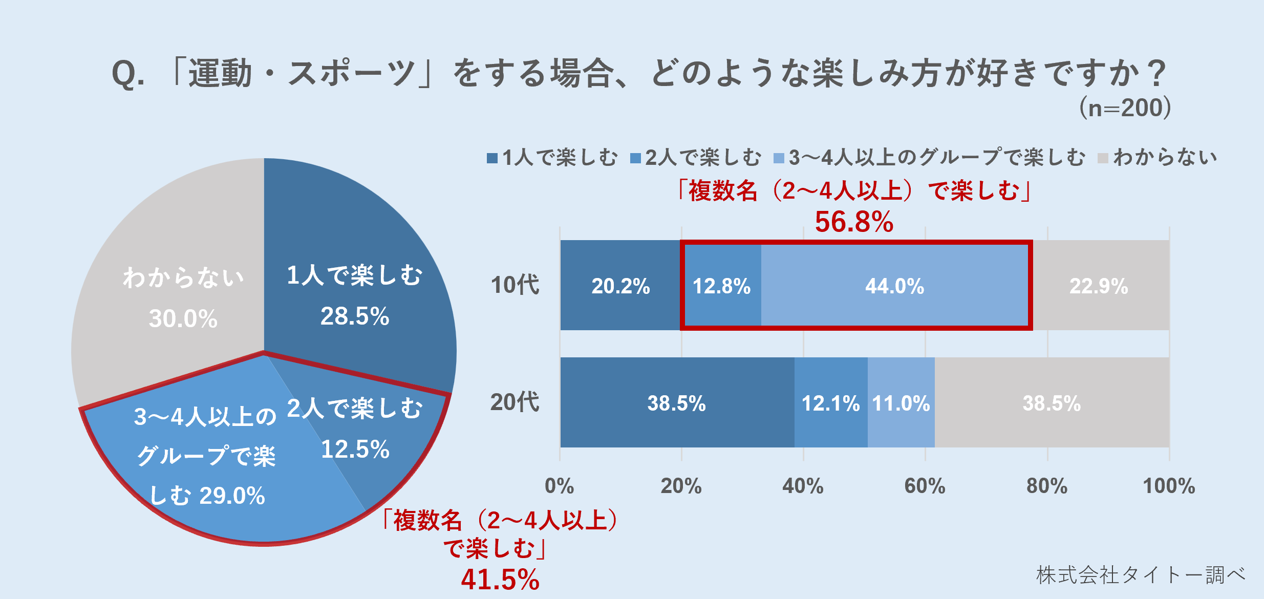 「運動・スポーツ」をする際の楽しみ方として、「複数(2~4人以上)の仲間やグループで楽しむ※5」(41.5%)が「1人で楽しむ」(28.5%)より多い結果となった。