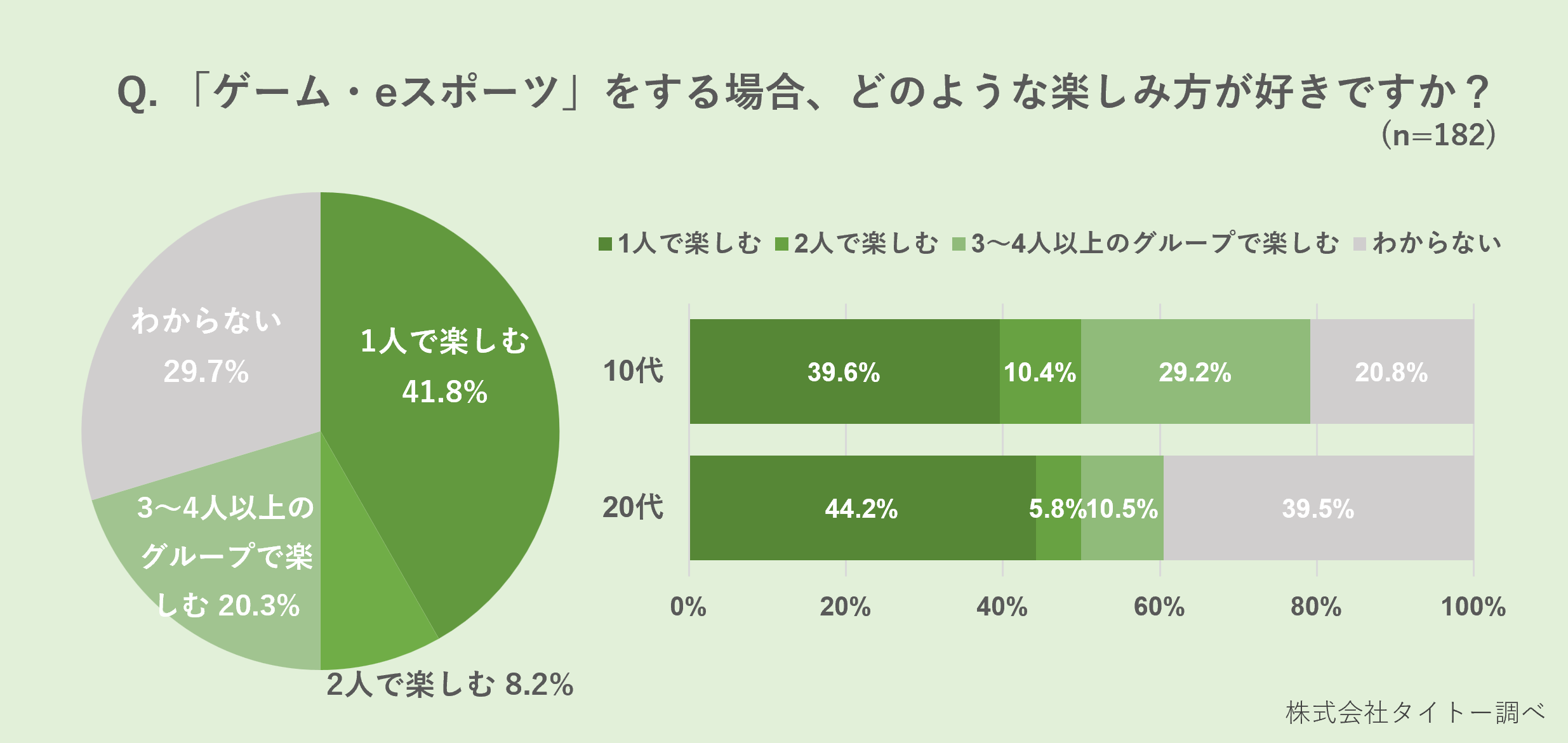 「ゲーム・eスポーツ」をする場合、「1人で楽しむ」(41.8%)人が最も多く、「運動・スポーツ」とは異なる結果となった。一方で、10代では「3~4人以上のグループで楽しむ」(29.2%)が次いで多く、スポーツやゲームに対して、仲間やグループで楽しみたいという傾向がみられた。