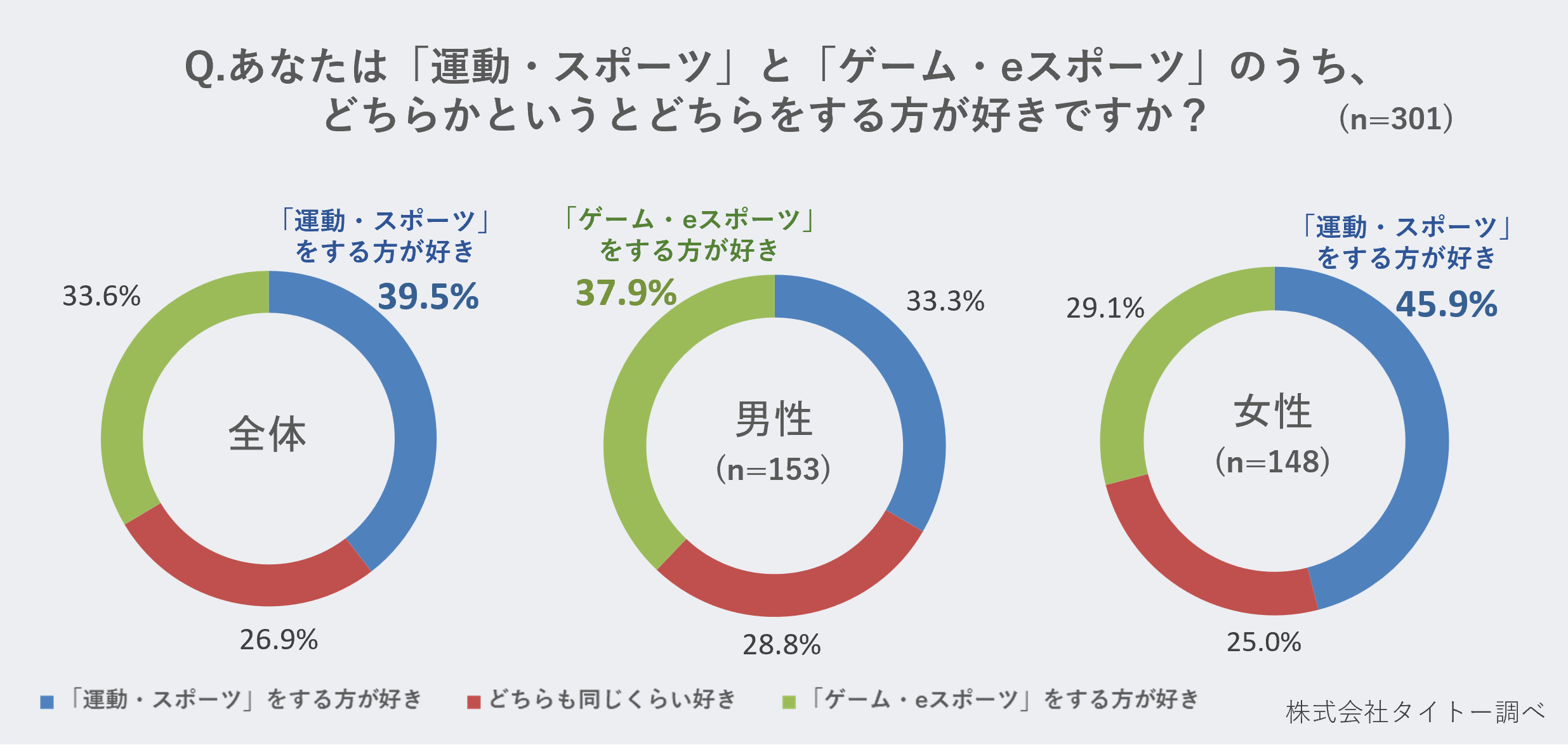 「運動・スポーツ」をする方が好き(39.5%)という人が「ゲーム・eスポーツ」をする方が好き(33.6%)を5.9pt上回った。また、「どちらも同じくらい好き」という人は26.9%だった。