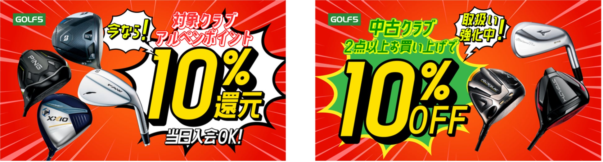 また、中古クラブ(ドライバー、フェアウェイ、ユーティリティ、アイアンセット、ウェッジ)を2点以上お買い上げでさらに10%OFFとなる企画を実施いたします。数量限定の奉仕品も多数ご用意しております。