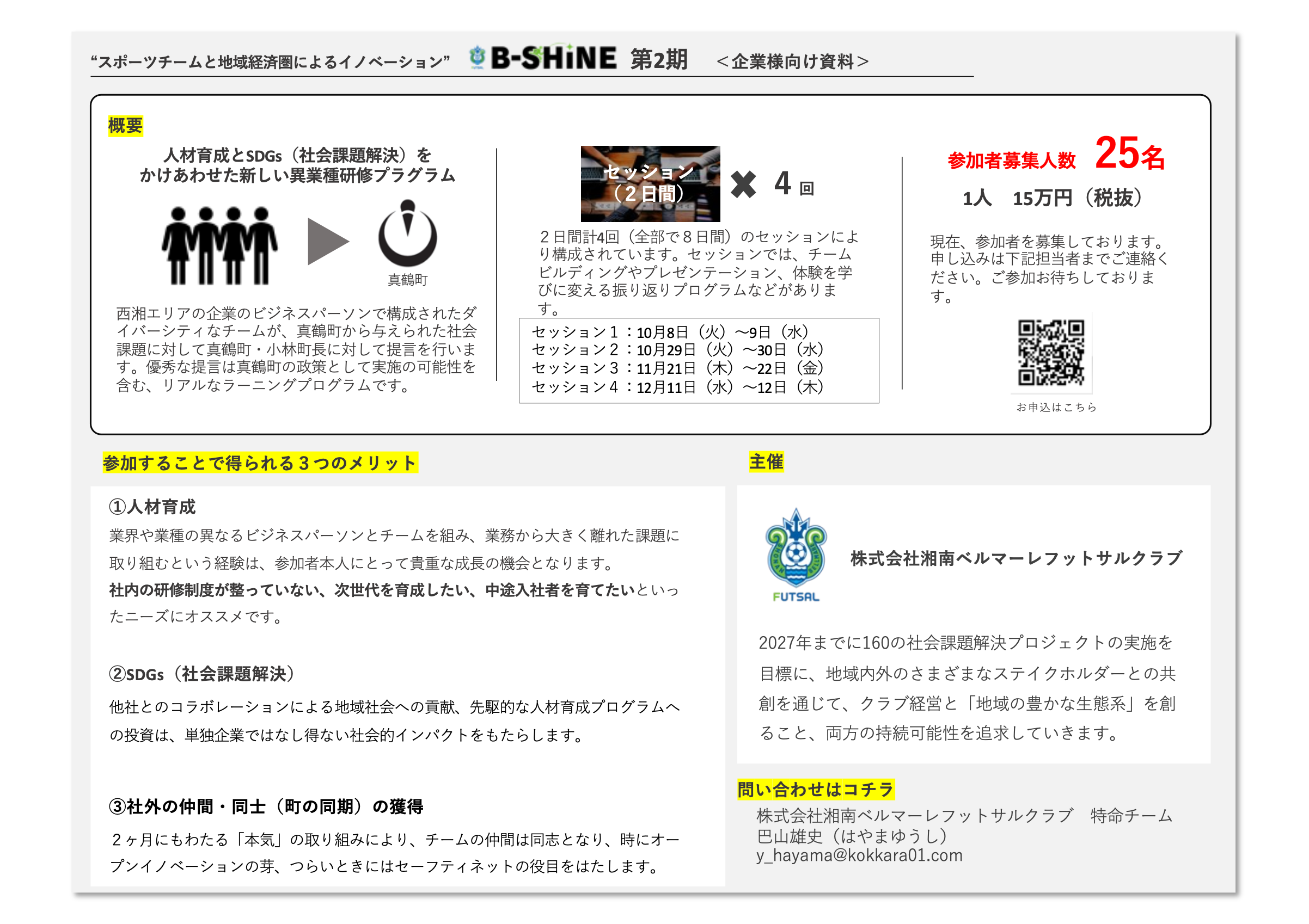 この度、湘南ベルマーレフットサルクラブでは、新たな人材育成プロジェクト【B-SHINE】の第二期の募集を開始することとなりましたので、おしらせいたします。