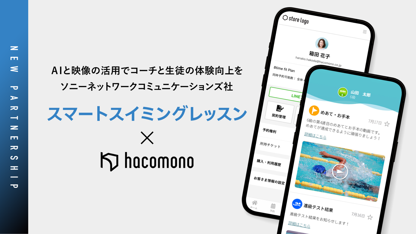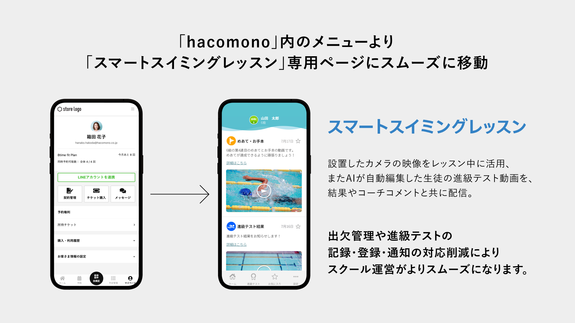 本連携により、スイミングスクールの会員・保護者の皆さまは、「hacomono」内のメニューより「スマートスイミングレッスン」専用ページにスムーズに移動できるようになります。