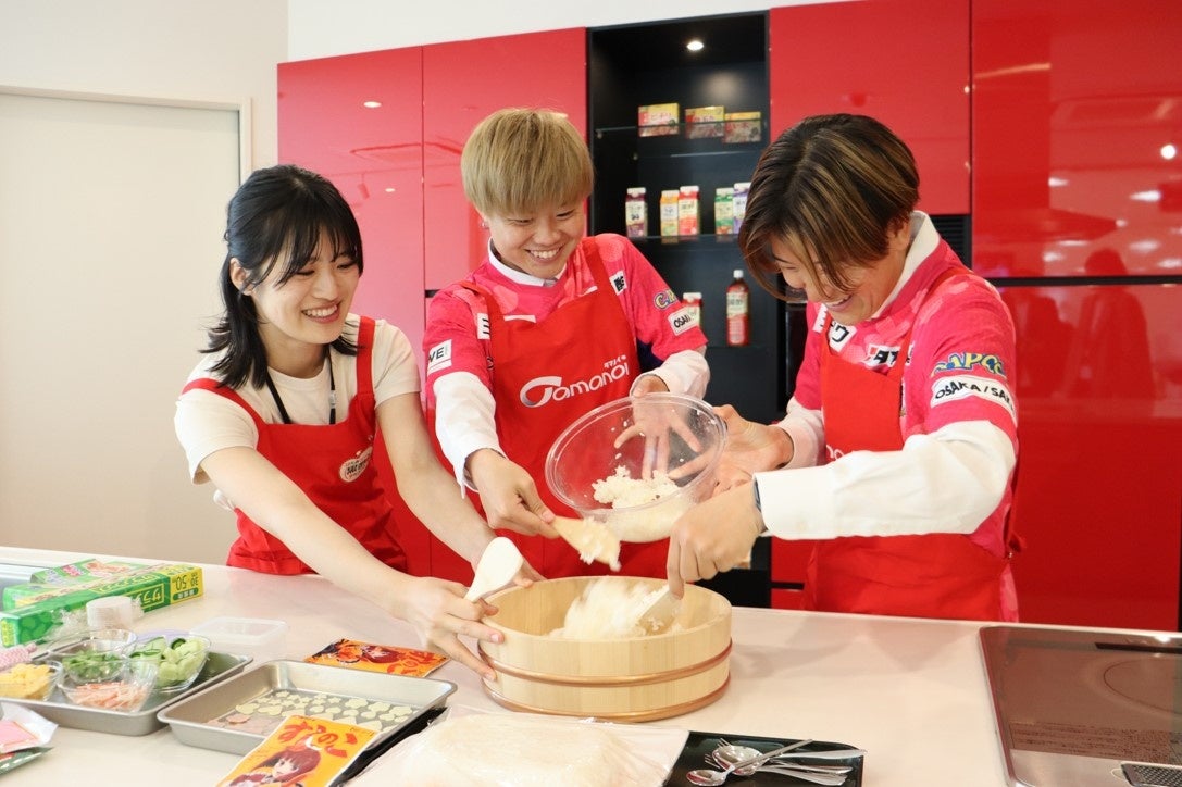 『すしのこ』を活用し、サッカーコートをモチーフにした「すしケーキ」作りに挑戦いただきました。 『すしのこ』で酢飯を作り、表面に青のりをまぶすことで芝生を表現。両選手ともにすしケーキ作りは初挑戦ということで、ケーキの土台にデコレーションする作業やサッカーボールのおにぎりを握る作業に苦戦している様子でした。「全然できない」と言葉を漏らしながらも、最終的には「すしケーキ作りって楽しい」、「意外とセンスあるかも」と言ったポジティブなコメントをいただき、両選手ともに満足した時間となりました。