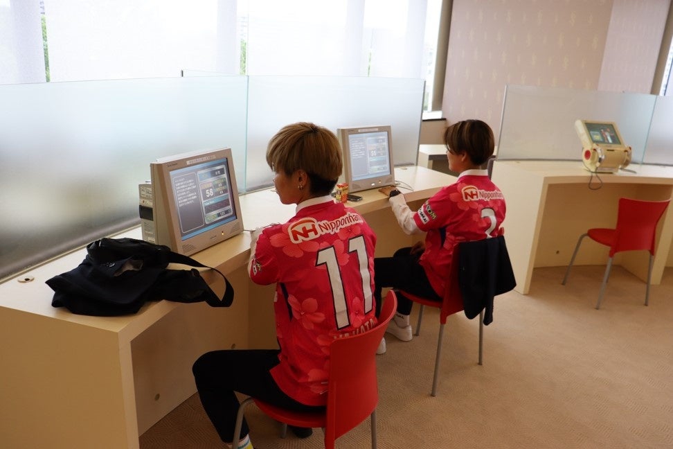 社内の健康チェック機器の体験会を実施。心拍数やストレス点数、血管年齢を測定し、両選手それぞれが、結果を和気あいあいと確認し合いました。
