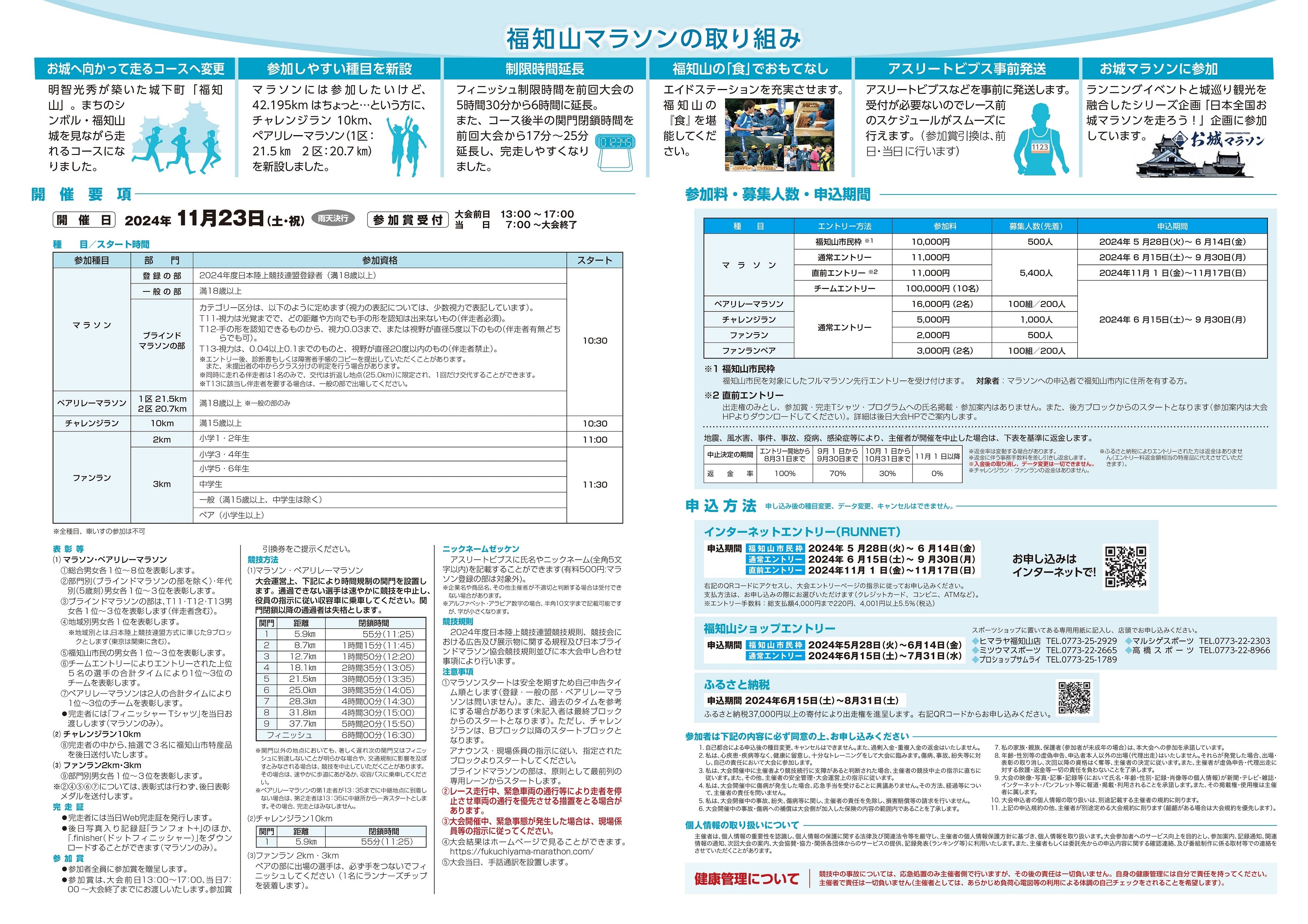 今大会のポイント ①福知山城のそばまで走れるコースに一部変更(新) ②ペアリレーマラソン、チャレンジラン10kmの新設(新) ③制限時間を5時間30分から6時間に延長(新) ④フルマラソンの参加料を12,000円から11,000円に値下げ。福知山市民は、さらに1,000円お得で10,000円に!(福知山市民枠)また、10人1チームでエントリーした際にも、1人当たり1,000円割引(福知山市民枠との併用はできません)(新) |