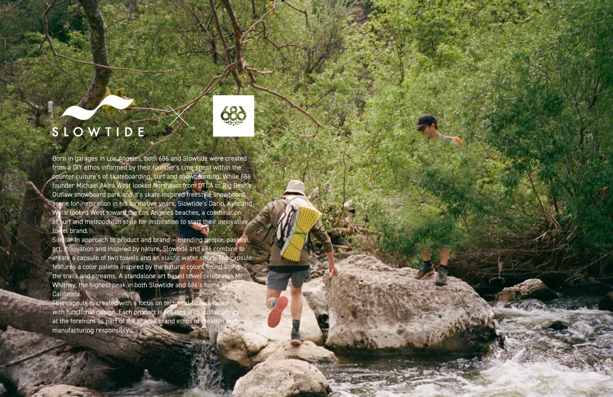 ハワイとカリフォルニアのビーチカルチャーにインスピレーションを受け、カスタム染色、ペイント、デザイン、アーティスト、フォトグラファーとのコラボをメインに、あらゆるライフスタイルに向けた高品質タオルを提案しているビーチタオルブランド「SLOWTIDE」とのコラボレーションモデルもあり、水のアクティビティやトレッキング、キャンプに普段着など幅広く使え、この夏のアクティビティにピッタリの商品になります。
