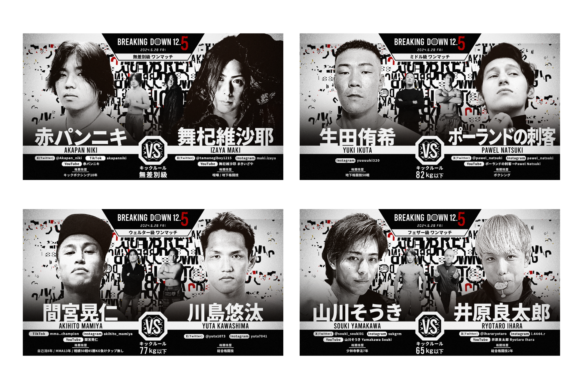 また、BreakingDown12で鮮烈のデビューを飾った、“最強喧嘩師”村田将一の息子である赤パンニキ選手が、舞杞維沙耶選手と対戦。前回、バンタム級トーナメント決勝で敗れた大野篤貴(ダンチメンあつき)選手も、元ボクシングWBA世界王者のファン・ホセ・ランダエタと激しい試合を繰り広げた虎之介選手と激突します。