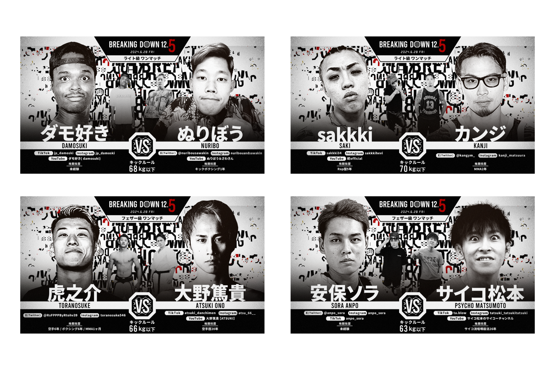 本大会では8試合を予定しています。BreakingDown9以来の出場となるぬりぼう選手が、前回のオーディションで会場の笑いをさらったダモ好き選手と対決するほか、BreakingDown12で判定負けした安保瑠輝也のいとこ安保ソラとサイコ松本が初勝利を掛けて戦います。