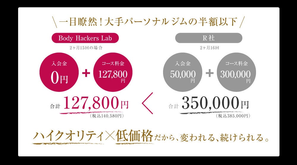 大手パーソナルジムでは2ヶ月30万円以上が相場ですが、ラボではその半額程度で「人生変える」体験を提供可能。