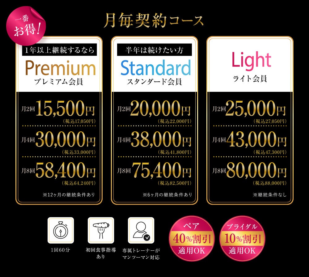 5回/39,600円(税込43,560円)〜 ※VIP会員割引適用時