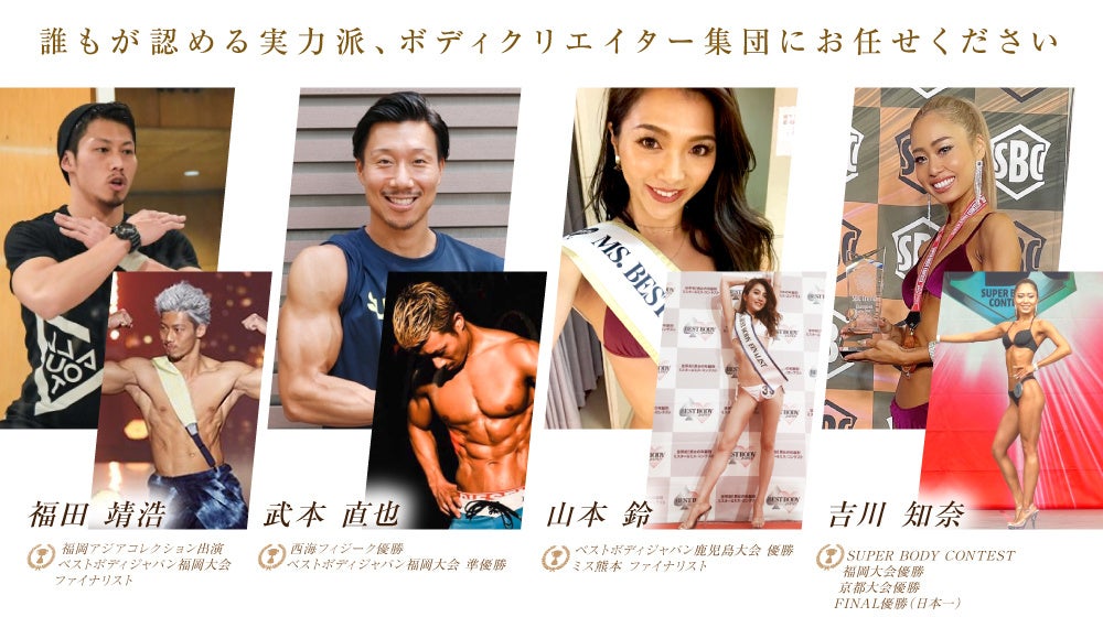 すべてのトレーナーが、今でこそ美ボディを競うコンテストで優勝したり、国内トップ選手として活躍するような経歴をもちますが「昔は今より15kg以上太っていて、自分に自信がなかった…」というような、ボディメイクで自分自身も人生変わった経験をもちます。