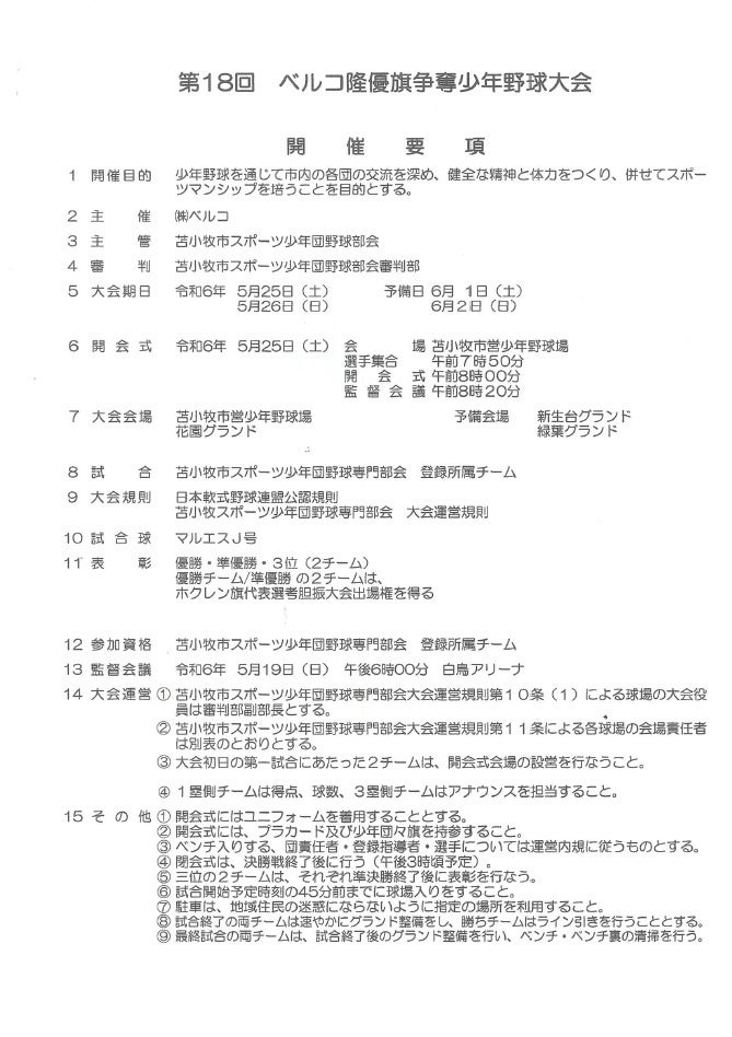 株式会社ベルコ(本社:大阪市、代表取締役社長:齋藤隆)は、スポーツを通じて少年の健全なる育成を目的に、2024年5月25日(土)と26日(日)に第18回ベルコ隆優旗争奪少年野球大会を開催いたしました。本大会には全国から多くの少年野球チームが参加し、熱戦が繰り広げられました。