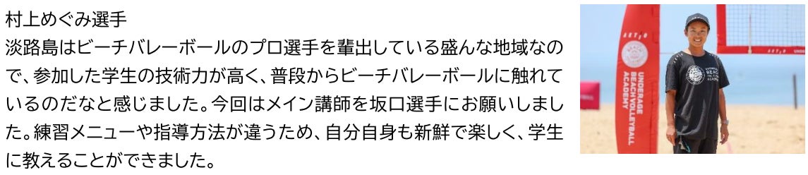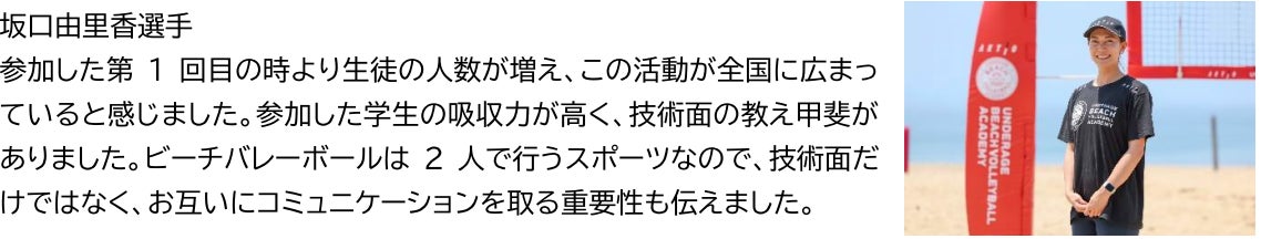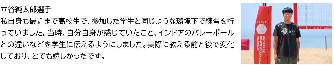 今回の「AKTIO アンダーエイジ・ビーチバレーボール・アカデミー」vol.6では、現役のプロビーチバレーボール選手が、部活動でビーチバレーボールやインドアのバレーボールに取り組む中学生・高校生を対象に、試合での戦略や戦術、コンビネーション、勝利への考え方などについて実践形式で指導を行いました。また、練習試合を通じ、プロから直接アドバイスを受けることで参加した生徒達にとって貴重な経験となりました。