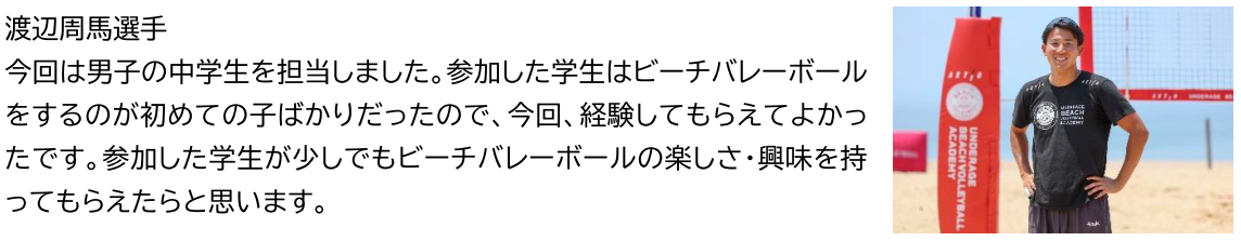 今回の「AKTIO アンダーエイジ・ビーチバレーボール・アカデミー」vol.6では、現役のプロビーチバレーボール選手が、部活動でビーチバレーボールやインドアのバレーボールに取り組む中学生・高校生を対象に、試合での戦略や戦術、コンビネーション、勝利への考え方などについて実践形式で指導を行いました。また、練習試合を通じ、プロから直接アドバイスを受けることで参加した生徒達にとって貴重な経験となりました。