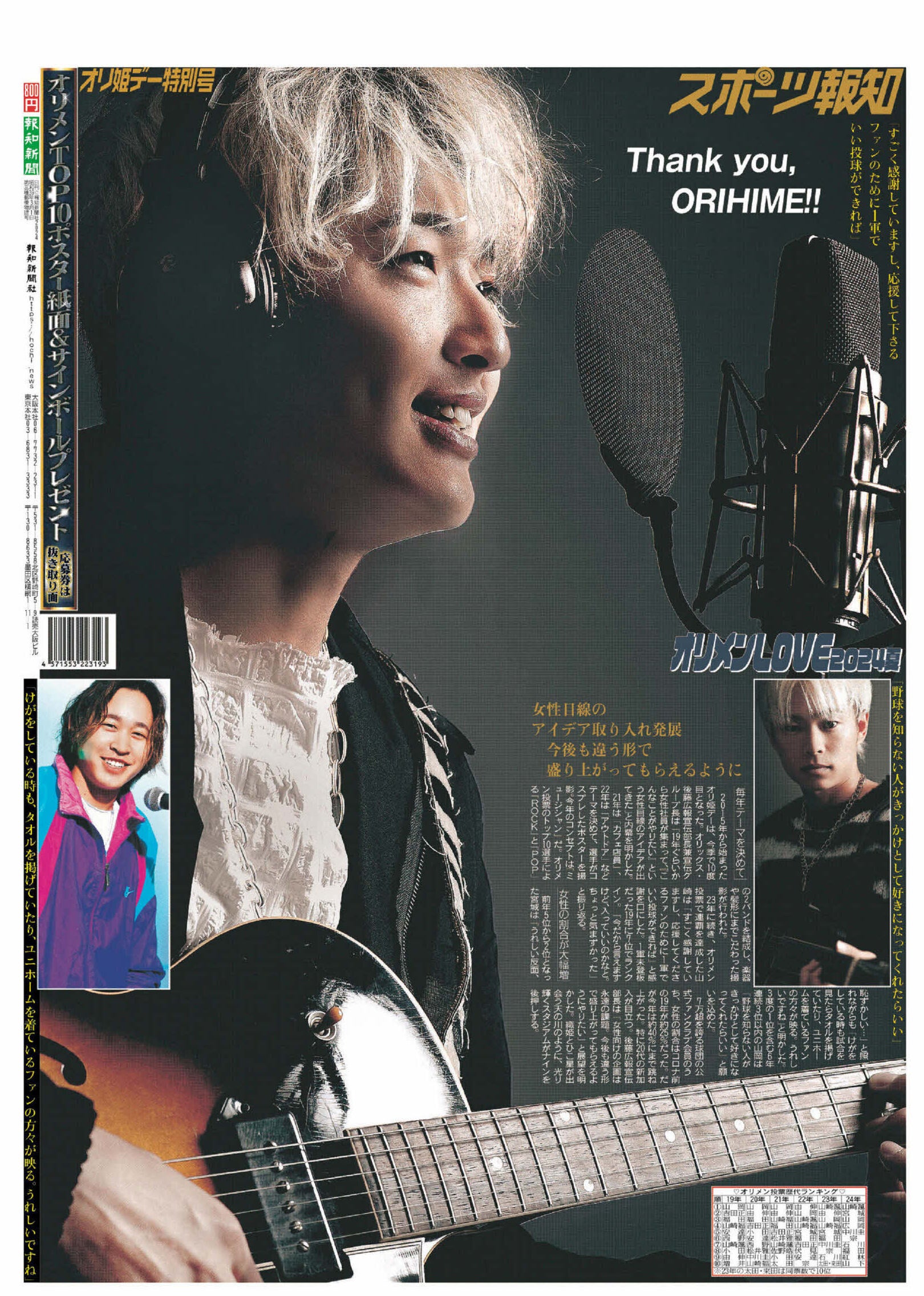 オリメン投票ランキング・トップ10の全選手が、今年のコンセプト「ミュージシャン」姿の巨大写真で登場。抜き取り紙面には「ROCK編」、「POP編」それぞれ5人ずつで組んだバンドの特大ポスターと、スポーツ報知のXで募集した「オリに願いを」メッセージの一部を掲載。トップ10全選手のサインボールプレゼントに応募できる特別号は、「Bs SHOP」(京セラD大阪内)、「BーWAVE」(神戸・三宮)などのほか、21日からはショップ報知(https://shop.hochi.co.jp/)でも購入できます。