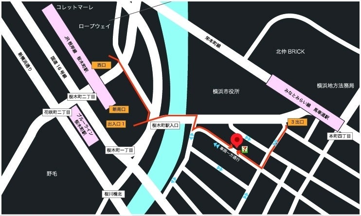 お店の場所は横浜市役所(新市庁舎)から徒歩30秒! JR桜木町新南口(出入口1)から徒歩2分。地下鉄みなとみらい線馬車道駅から徒歩1分。店舗前には路上パーキングメータもあるアクセス抜群の場所です。