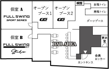 店内のレイアウトは個室とオープンブース、ダイニングバーエリア、ダーツバーエリアとなっています。 個室A,Bはパーティー利用も可能としており、15名収容できる大部屋でホールインワン記念パーティーや会社イベント、撮影、など色々なシーンで利用ができます。