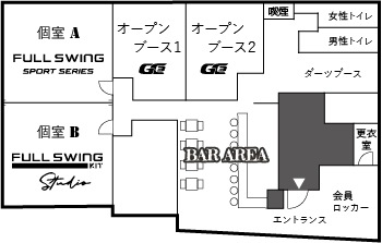 店内のレイアウトは個室とオープンブース、ダイニングバーエリア、ダーツバーエリアとなっています。 個室A,Bはパーティー利用も可能としており、15名収容できる大部屋でホールインワン記念パーティーや会社イベント、撮影、など色々なシーンで利用ができます。