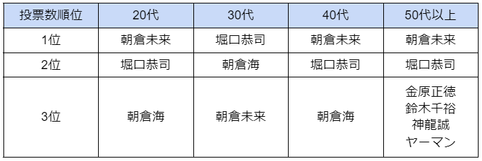 堀口恭司選手は、「20代」、「40代」、「50代以上」の3つの年代でも、2位を獲得しています。