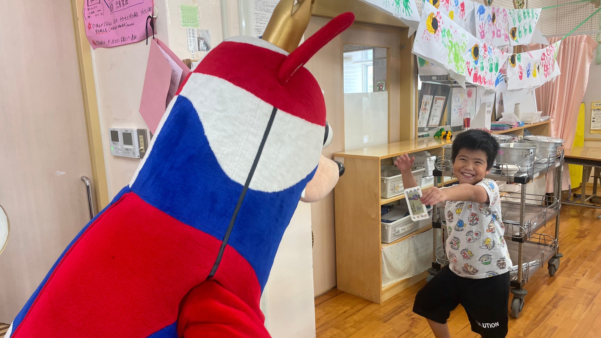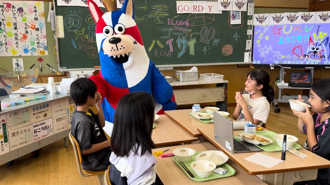 給食時間にサプライズで登場したゴーディーに子どもたちは驚いた様子でしたが、「いつもより海苔おいしかったよ」、「ゴーディーに会えて嬉しい」など多くの子どもたちから声をかけていただき、楽しく交流いたしました。