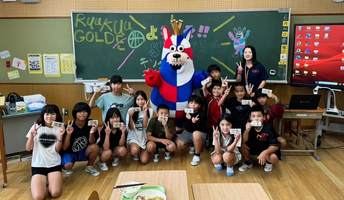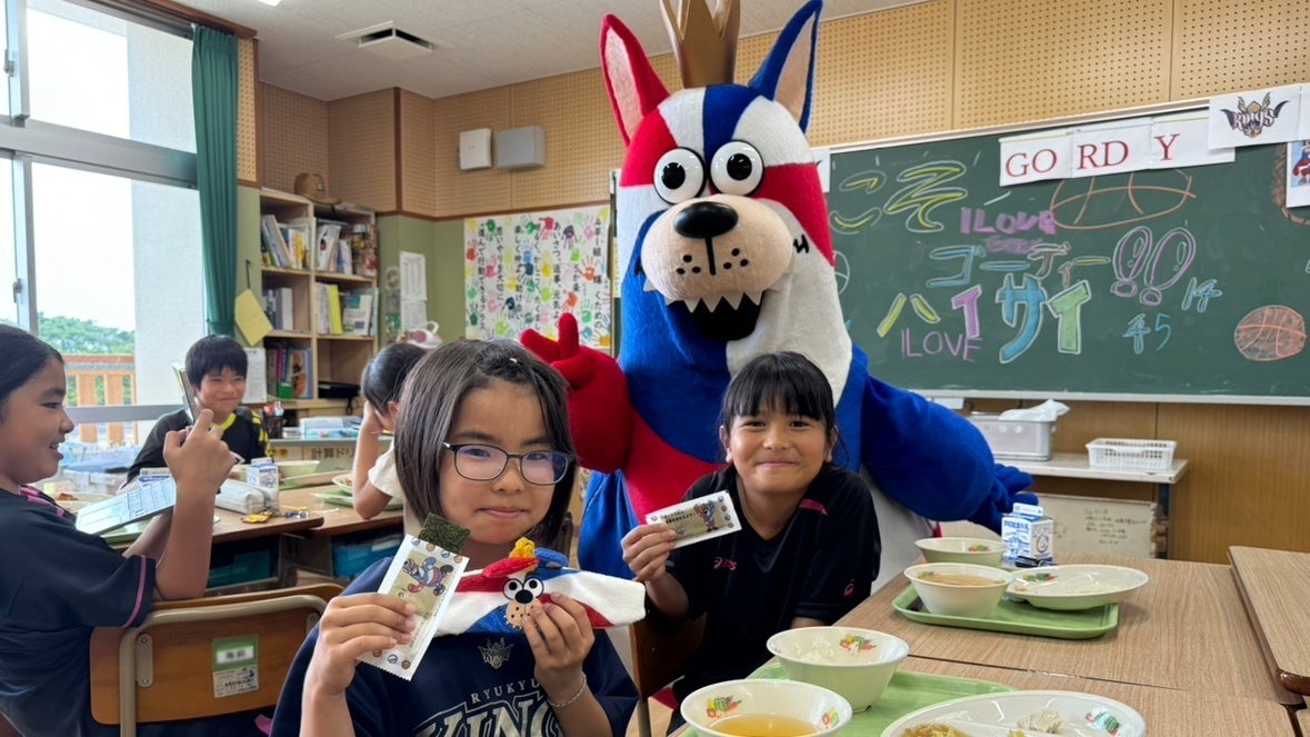 学校給食での「琉球ゴールデンキングスデザイン海苔」が県内各地の小中学校でも提供が開始されたことに伴い、ゴーディーがホームタウン沖縄市にある「沖縄県立美咲特別支援学校」と伊是名村の「伊是名小学校」を訪問いたしました。