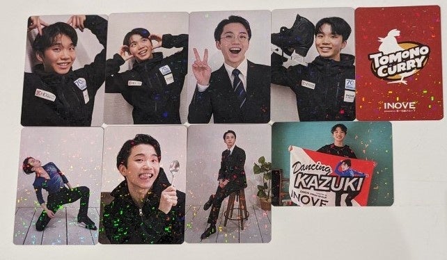 『TOMONO CURRY』のパッケージの中にはレトルトカレー、専用スパイスとともにトレーディングカードが1枚封入されています。トレーディングカードは全8種類。すべて撮りおろしの画像を使用しています。また、8種類の絵柄それぞれに数量限定で友野一希選手の直筆サイン入りのトレーディングカードが封入されています。