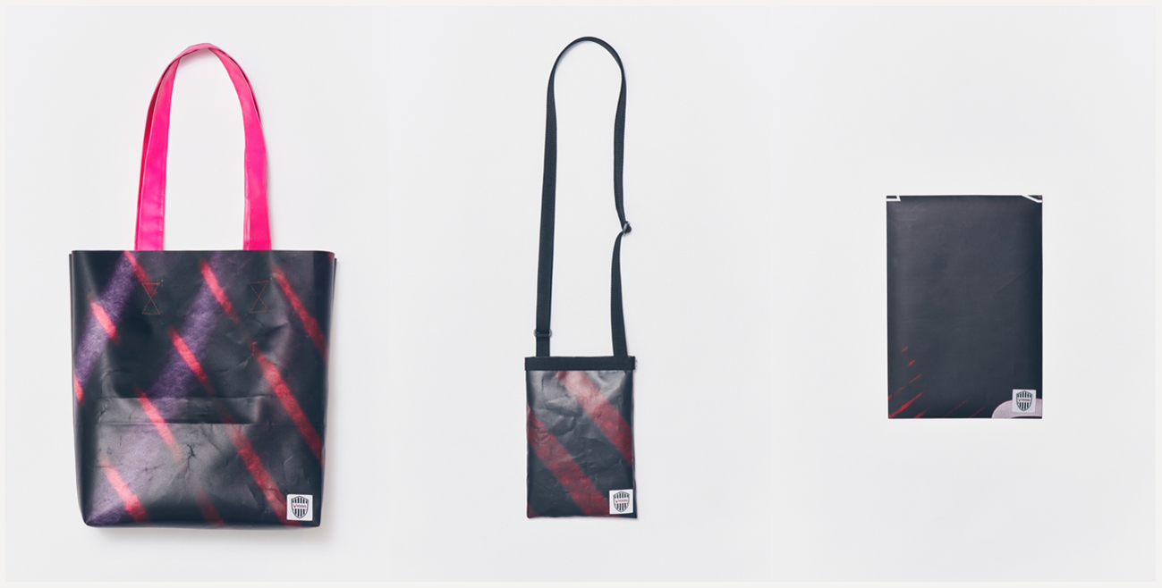 販売アイテム:アップサイクルトートバッグ 13,200円(税込)、アップサイクルサコッシュバッグ 8,800円(税込)、アップサイクルエンベロープ 5,500円(税込)
