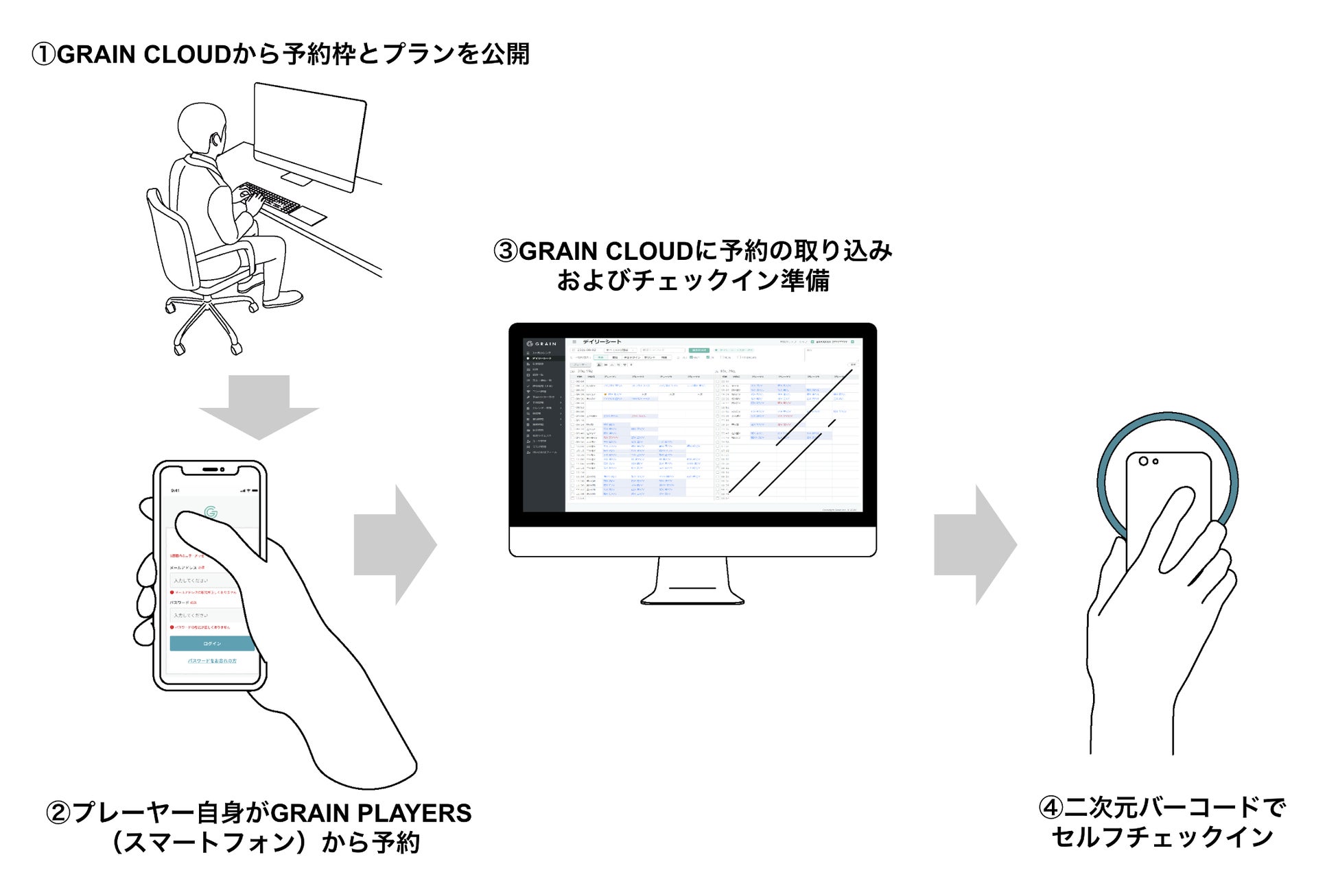 今回提供を開始する「GRAIN PLAYERS」は、ゴルフ場のWebサイト(自社Web)に搭載する予約システムと二次元バーコードによるセルフチェックインを実現するGRAIN CLOUDのオプションシステムです。本システムでは、ゴルフ場業務の効率化に繋がる仕組みを多く搭載しています。