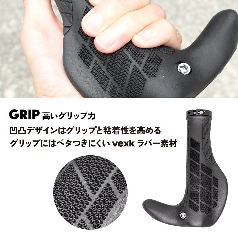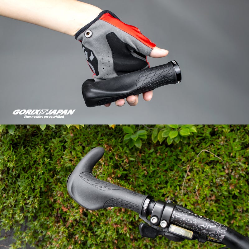 長時間のライディングに向いているエルゴ形状は、手首や掌の疲れの軽減と高いフィット感を得られます。