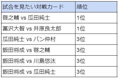 試合で見たい対戦カードの調査結果では「啓之輔 vs 瓜田純士」、「冨沢大智 vs 井原良太郎」の2カードが1位を獲得しています。