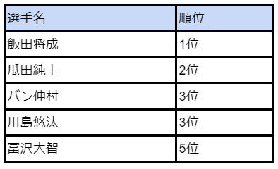 その他の順位では、2位「瓜田純士」選手、3位には「バン仲村」選手と「川島悠汰」選手の2名が同順位を獲得し、5位は「冨沢大智」選手がランク入りを果たしています。