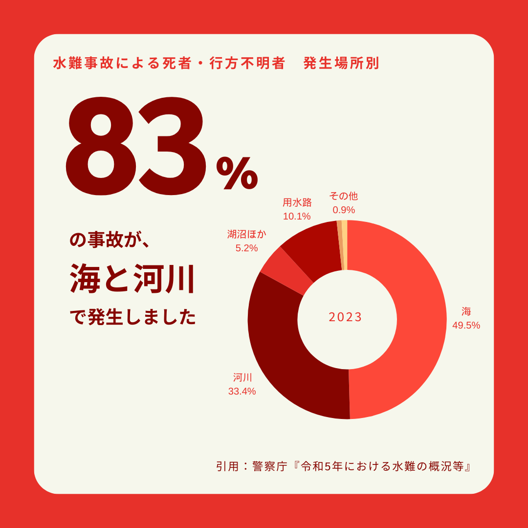 水難事故の8割以上は「海」または「河川」で発生し、3割以上が夏季(7~8月)に集中していました。