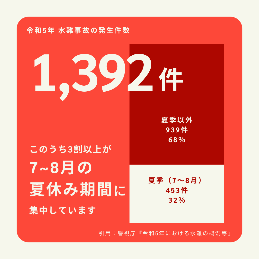 日本国内で令和5年度は1,392件の水難事故が発生し、死者・行方不明者は743人でした。